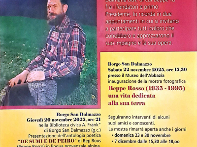 Ricorrendo trent'anni dalla scomparsa del prof. Beppe Rosso l'Associazione Pedo Dalmatia odv, di cui Beppe fu fra i fondatori e primo Presidente, lo ricorda con una mostra a Borgo San Dalmazzo fino al 7 dicembre.
