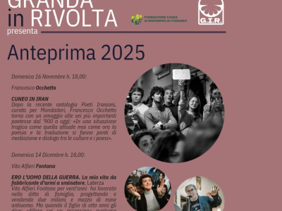Per la rassegna “Granda in Rivolta”, appuntamenti letterari a Fossano presso La Vineria in Piazzetta, in Via Garibaldi 40, alle ore 18: domenica 16 novembre con Francesco Occhetto, autore di Cuneo e Iran, e domenica