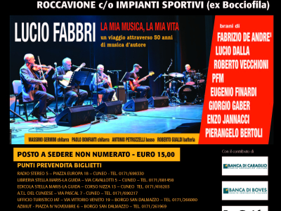 Sabato 6 dicembre alle ore 21,00 a Roccavione presso gli impianti sportivi (ex Bocciofila) si tiene il concerto (unica data in Piemonte 2025) di Lucio Fabbri & Friends, un viaggio attraverso 50 anni di musica d'autore.
