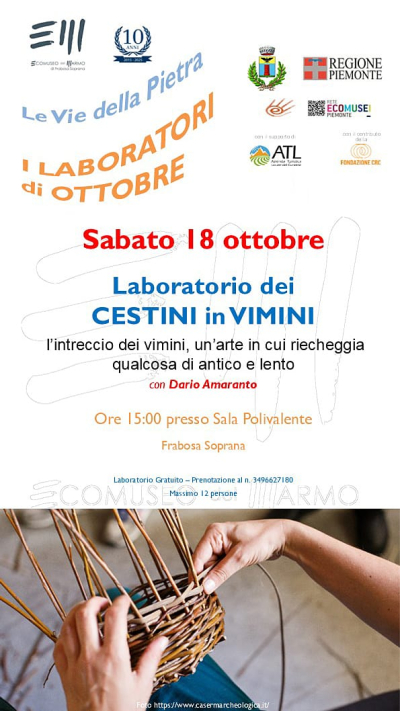 L'Ecomuseo del Marmo invita tutti e tutte a quattro laboratori gratuiti i sabati di ottobre, per approfondire antichi saperi e imparare in compagnia di esperti. Terzo appuntamento sabato 18 ottobre con il laboratorio dei cestini in vimini con Dario Amaranto, alle ore 15.00 presso la sala polivalente comunale (via Cantone, 15). Prenotazione obbligatoria al +39 349 662 7180 (massimo 12 persone).