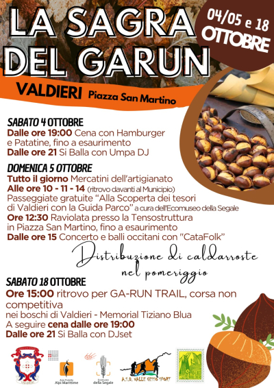 La sagra del garun di Valdieri si conclude sabato 18 ottobre con un evento sportivo e serale. Alle ore 15 si terrà la ga-run trail, una corsa non competitiva nei boschi di Valdieri, in memoria di Tiziano Blua. A seguire, alle ore 19:00, cena per tutti i partecipanti e la serata terminerà con musica e divertimento grazie al DJset, che farà ballare fino a tarda notte. Iscrizioni contattando la Valle Gesso Sport.