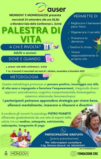 Auser Mondovì e Monregalese propongono una serie di incontri il mercoledì dalle ore 15 alle 16.30 presso la sala Scimè a Mondovì, rivolta ad adulti e anziani per scoprire strategie per pensare positivo e creare uno stile di vita sano. Partecipazione gratuita su prenotazione telefonica. Gli incontri saranno condotti dallo psicologo Pietro Piumetti. Gli incontri si terranno l'8 e 22 ottobre, il 12 e 26 novembre, il 3 e 17 dicembre 2025.