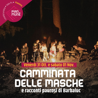 Venerdì 31 ottobre e sabato 1 novembre, il Rifugio Pian Munè di Paesana organizza, in occasione di Halloween, una passeggiata serale nel bosco, tra ombre e sussurri con Barbaluc che accompagnerà con storie d'altri tempi: racconti paurosi al punto giusto, popolati da Masche e creature tenebrose che animano le notti più spaventose dell’anno. Un’esperienza unica tra leggenda e mistero. Prenotazione consigliata.