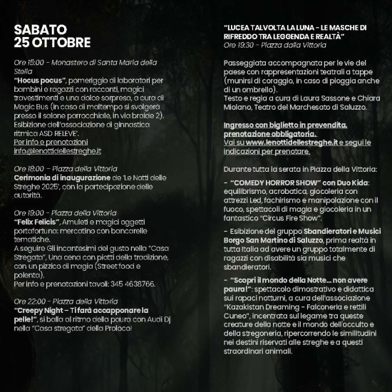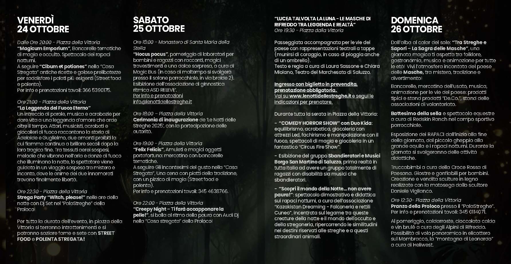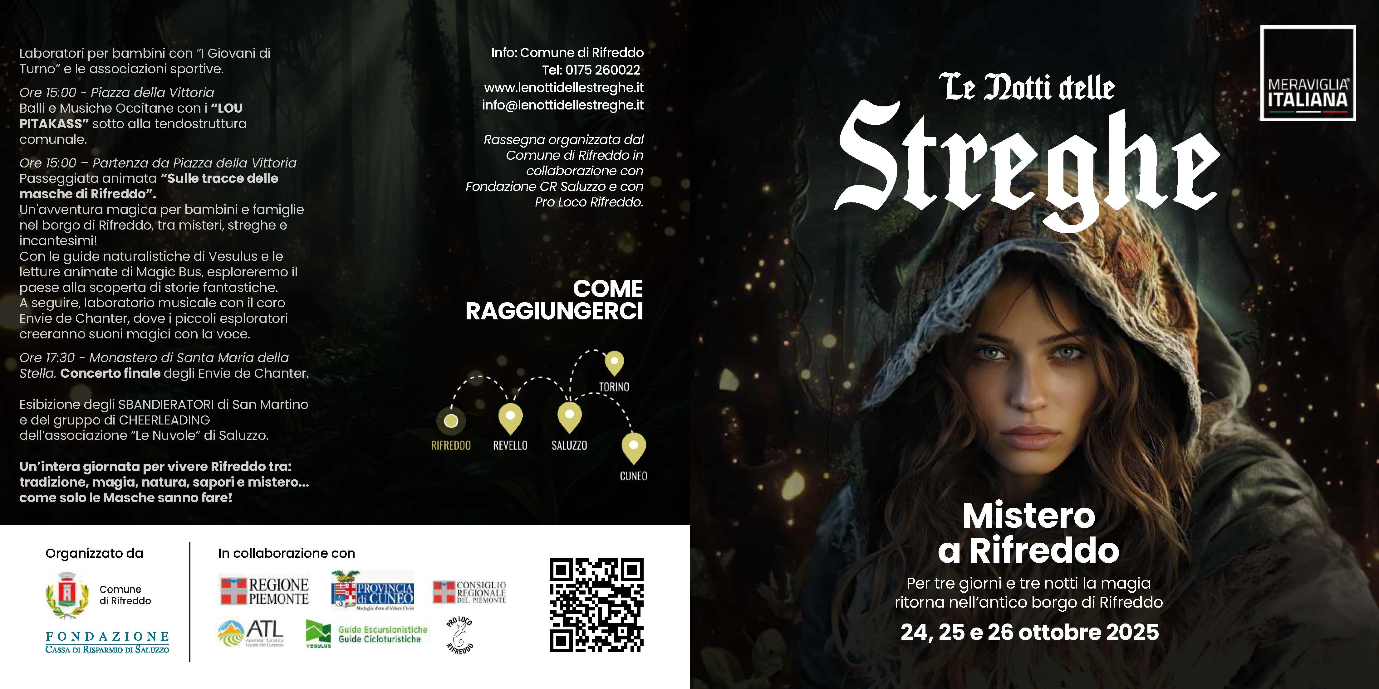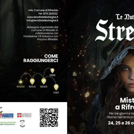 Da venerdì 24 a domenica 26 ottobre tornano a Rifreddo le "Notti delle Streghe": le suggestive ambientazioni del borgo antico, del Monastero di Santa Maria della Stella e del massiccio del Mombracco ospiteranno numerosi appuntamenti per i quali è necessario munirsi di coraggio (e di un ombrello in caso di maltempo). Il programma completo, qui.