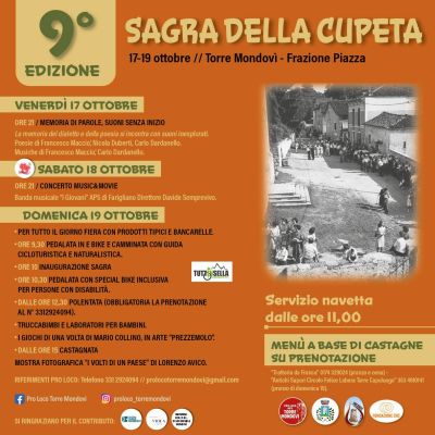 Dal 17 al 19 ottobre, la frazione Piazza di Torre Mondovì ospiterà la 9ª edizione della Sagra della Cupeta, un appuntamento ormai atteso che unisce sapori, storia e spettacolo in un’atmosfera autenticamente piemontese.