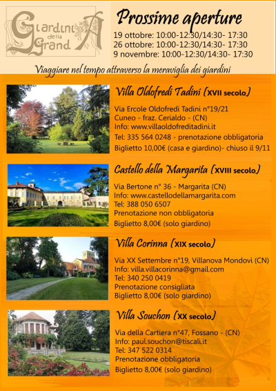 Il castello della Margarita possiede un magniloquente parco alla francese e conserva diversi ambienti, ciascuno studiato per avere caratteristiche peculiari di natura storica, botanica ed ambientale. Il 19 e il 26 ottobre il giardino verrà aperto, dalle 10.00 alle 17.30 con la possibilità di fare visite guidate ogni ora. La prenotazione non è necessaria.