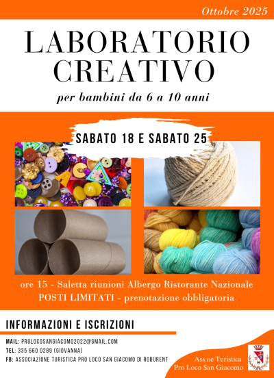 Sabato 18 e sabato 25 ottobre la Pro Loco San Giacomo organizza due "Laboratori creativi" per i bambini dai 6 ai 10 anni. L'appuntamento è alle ore 15:00 presso la saletta riunioni dell'Albergo Ristorante Nazionale. I posti sono limitati e la prenotazione è obbligatoria via mail o per telefono.