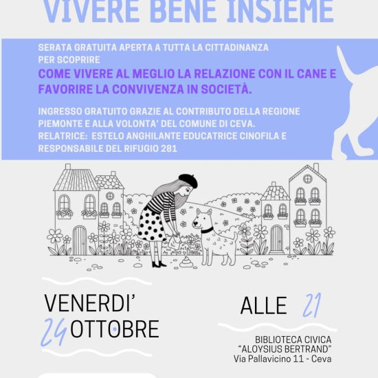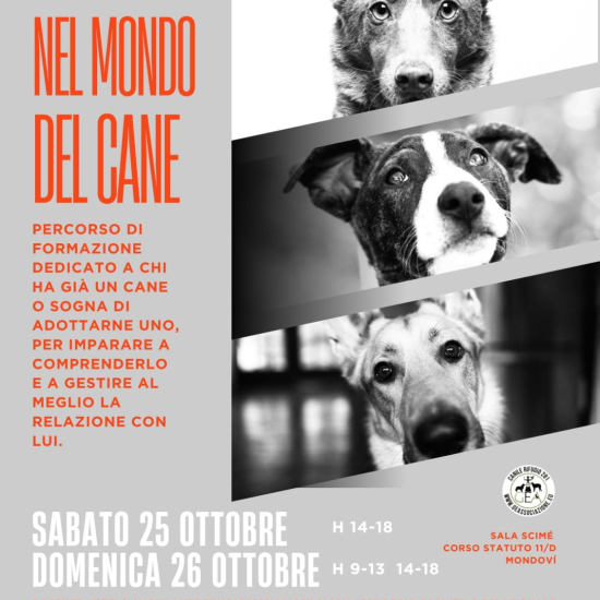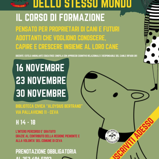 Dal 16 ottobre al 22 novembre arrivano a Mondovì e Ceva un ricco calendario di incontri, corsi e iniziative gratuite, rivolte a chi possiede un cane, a chi desidera adottarne uno, e a tutti coloro che vogliono conoscere meglio questi straordinari compagni di vita ma anche a chi volesse avvicinarsi al mondo del volontariato presso il Canile Rifugio 281. Gli appuntamenti saranno condotti da Estelo Anghilante, educatrice cinofila con approccio cognitivo, responsabile del Canile Rifugio 281 e autrice. Da anni Anghilante si impegna nella divulgazione e nella formazione per favorire una convivenza armoniosa tra persone e cani.
