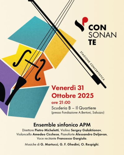 Venerdì 31 ottobre alle ore 21, presso la Scuderia B – Il Quartiere (Fondazione A. Bertoni, Saluzzo), si apre la Stagione Concertistica Consonante 2025/26 con un concerto che vedrà come protagoniste le musiche di Martucci, Respighi e G.F. Ghedini, eseguite dall’Ensemble Sinfonico APM diretto dal M° Pietro Micheletti, con la partecipazione dei solisti Sergey Galaktionov (violino), Amedeo Cicchese (violoncello), Alessandro Deljavan (pianoforte) e la voce recitante di Francesco Gargiulo.