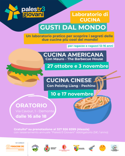 Lunedì 10 e 17 novembre, dalle ore 16,00 alle ore 18,00 presso l'oratorio di Demonte, l'associazione "Palestr3 Giovani" organizza due laboratori di cucina cinese con Peixing Lang del Ristorante Pechino. Evento gratuito, prenotazione necessaria.
