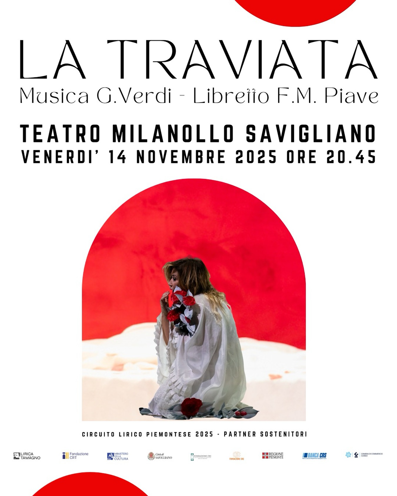 Venerdì 14 novembre, alle ore 20.45, presso il Teatro Milanollo di Savigliano andrà in scena "La Traviata" di Giuseppe Verdi. Direzione artistica S. Scacchetti, regia D. Garattini Raimondi, orchestra B. Bruni. Produzione di Lirica Tamagno Camponeschi Music & Arts. Ingresso da 24 a 27 euro secondo ordine di posto.