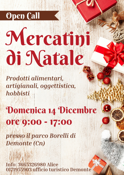 Domenica 14 dicembre, dalle ore 9,00 alle ore 17,00 presso il Parco Borelli di Demonte, tornano i caratteristici "Mercatini di Natale". Vi aspettiamo numerosi!