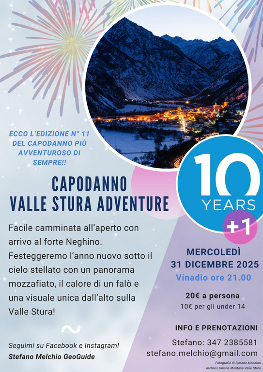 Mercoledì 31 dicembre, a partire dalle ore 21,00 a Vinadio, vi aspetta una facile camminata all'aperto al Forte Neghino in compagnia della guida naturalistica Stefano Melchio. Evento a pagamento, prenotazione necessaria.