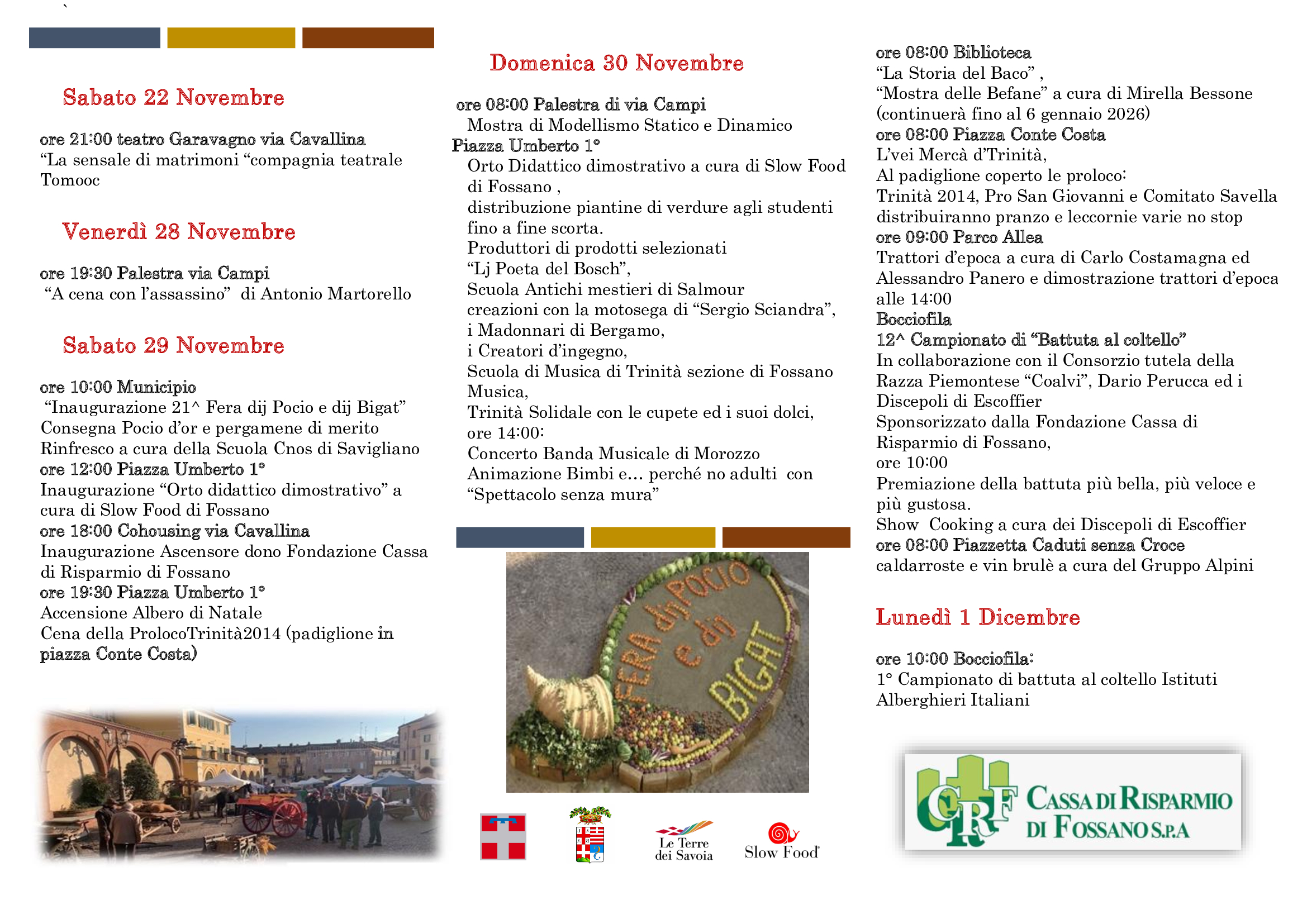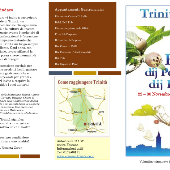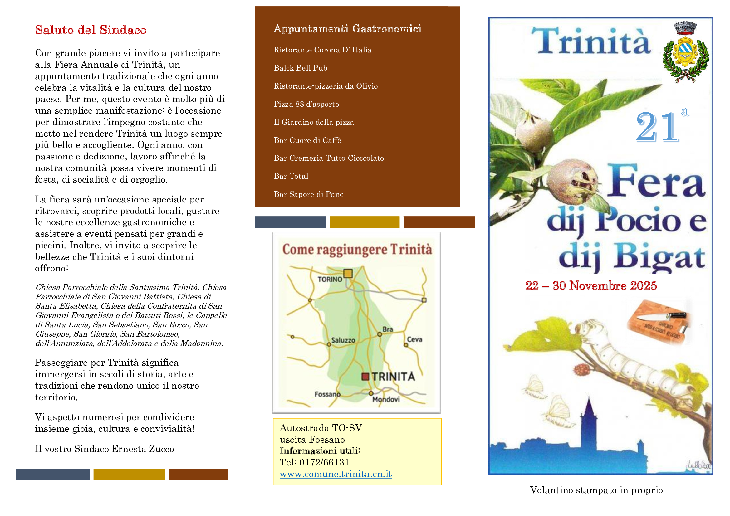 Da sabato 22 a domenica 30 novembre Trinità ospita la "21^ Fera dij Pocio e dij Bigat": tradizionale appuntamento fieristico dedicato alle nespole e ai bachi da seta con tantissimi momenti di divertimento, eventi culturali, orti didattici, appuntamenti enogastronomici ed il 12^ Campionato di "Battuta al Coltello".