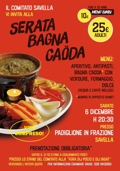 Il Comitato SAVELLA vi invita il 6 Dicembre alle ore 20:30 alla Serata BAGNA CAÖDA, presso il padiglione in frazione Savella! La prenotazione è obbligatoria entro il 3/12 fino ad esaurimento posti presso lo stand del comitato alla "Fera dij Pocio e dij Bigat",