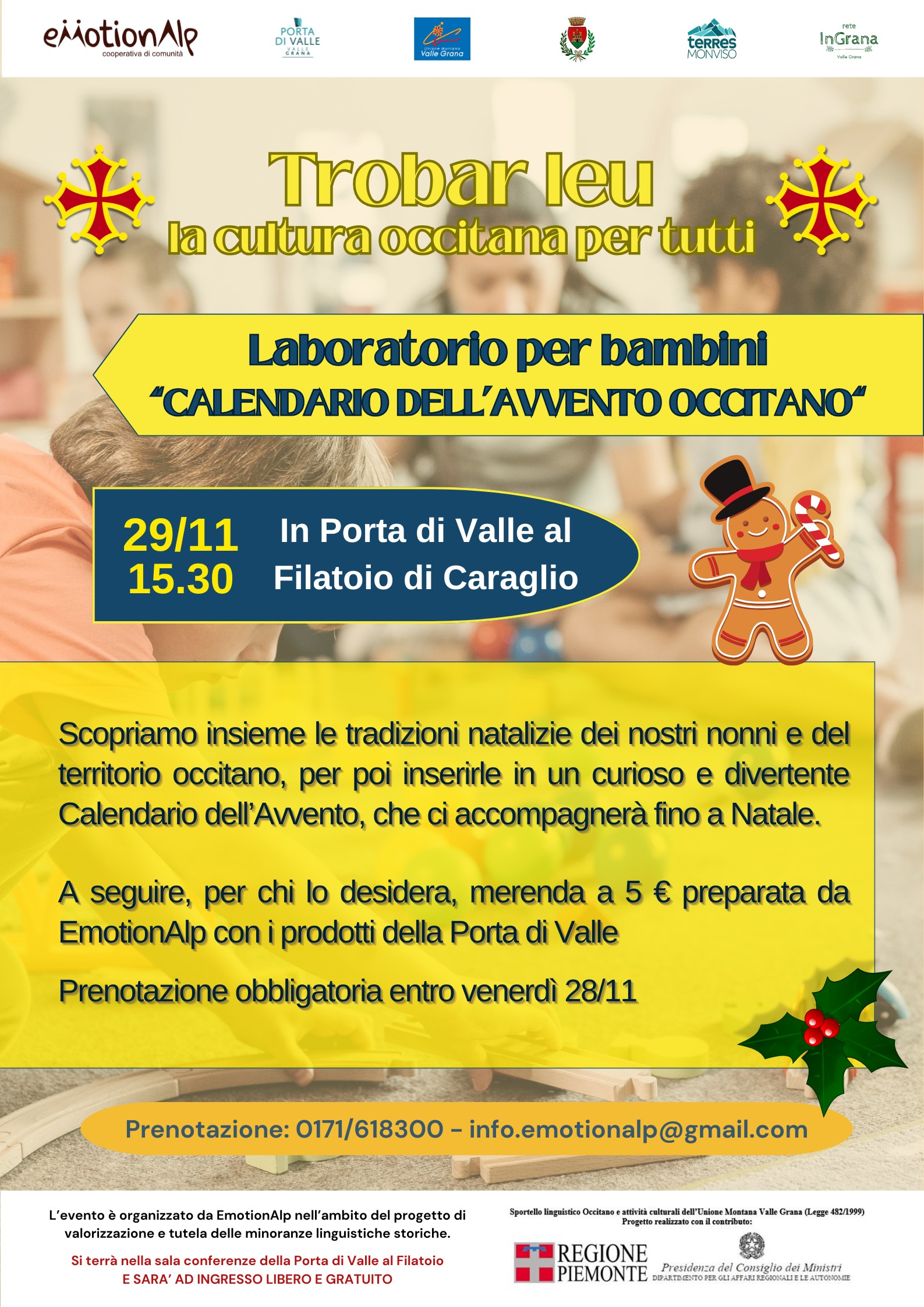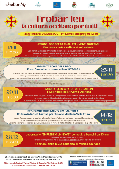 Ritorna la rassegna “Trobar Leu – La Cultura Occitana per tutti” organizzata dalla Cooperativa EmotionAlp in Porta di Valle della Valle Grana. Gli appuntamenti della rassegna saranno distribuiti tra novembre (dal 15) e dicembre, cinque in totale, tra lezioni, concerto, presentazioni, proiezioni e laboratori.