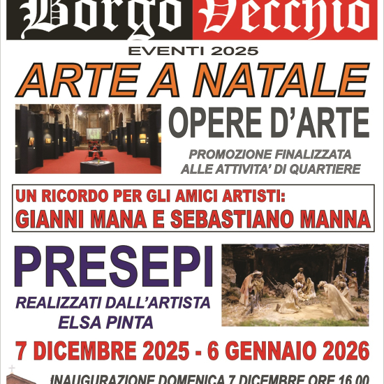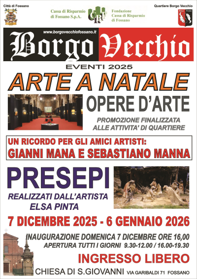 Da domenica 7 dicembre a martedì 6 gennaio la chiesa di San Giovanni in Borgo Vecchio a Fossano ospita una mostra di bellissimi presepi realizzati dall'artista Elsa Pinta ed una contestuale esposizione di opere d'arte a cura del Comitato del Borgo. Aperto tutti i giorni dalle 9.30 alle 12.00 e dalle 16.00 alle 19.30. Ingresso libero.