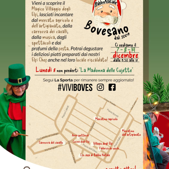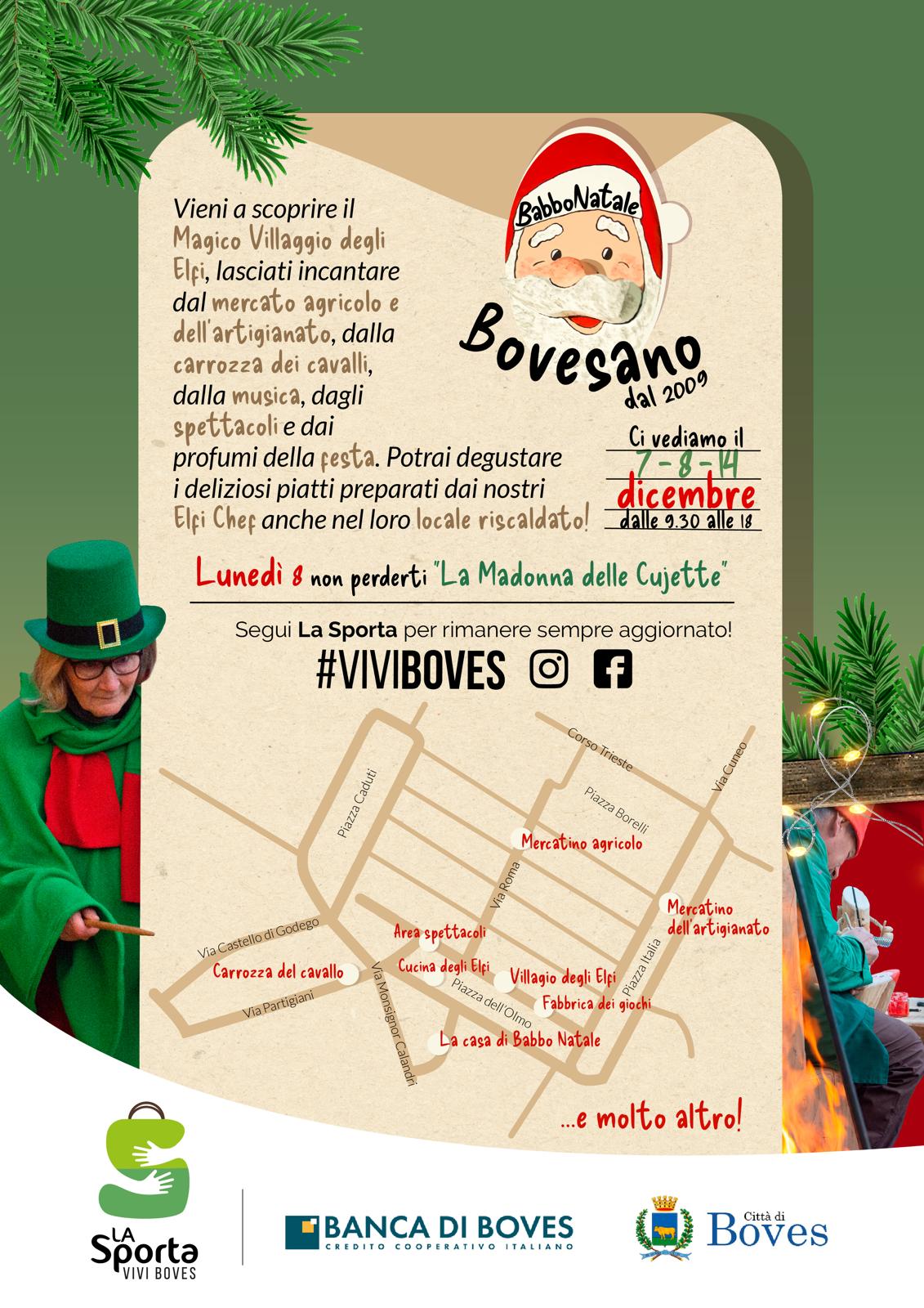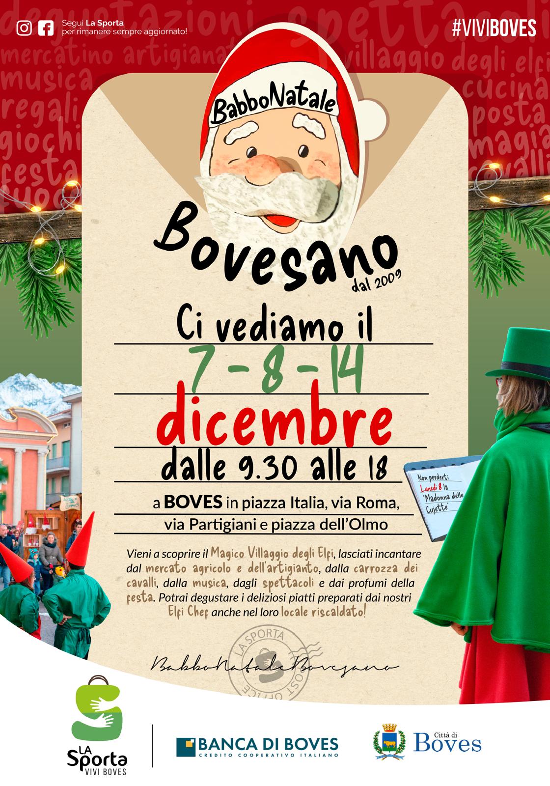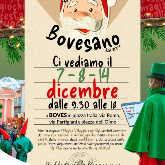 Domenica 7, lunedì 8 e domenica 14 dicembre Boves si trasforma nel magico villaggio di Babbo Natale. Durante le giornate tantissimi volontari, nelle vesti degli elfi di Babbo Natale, scendono in piazza e animano la festa tra intrattenimenti, giochi, spettacoli, musica, mercatini di Natale, laboratori e tanto buon cibo.