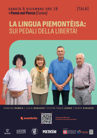 Sabato 6 dicembre alle ore 16, presso Famù nel Parco a Cuneo, si terrà il talk "La lingua piemontèisa: sui pedali della libertà!", promosso dal Cuneo Bike Festival e dal festival Poeticôni. L'evento sarà l'occasione per scoprire la lingua del territorio come strumento di libertà di movimento interiore. Ingresso gratuito con prenotazione obbligatoria su Eventbrite.