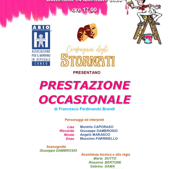 Domenica 14 dicembre, alle ore 17 presso il Teatro Toselli di Cuneo la “Compagnia degli Stornati” in collaborazione con l’ABIO di Cuneo ODV presenta la commedia brillante in due atti “Prestazione occasionale” di Francesco Brandi. Ingresso libero con prenotazione obbligatoria.