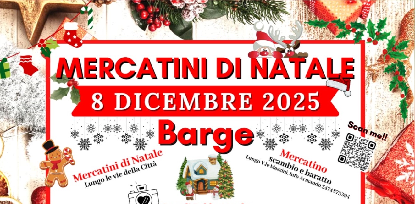 L'8 Dicembre 2025 arriva il mercatino di natale nel centro storico di Barge, unendo tradizione e l'atmosfera da fiaba tra luci scintillanti, prodotti artigianali e tipici, tra cui vin brule, cioccolata calda, caldarroste e street food! Ci sarà musica dal vivo, momenti di spettacolo, presepi e intrattenimento per i più piccoli con l'arrivo di Babbo Natale pronto ad accogliere tutte le letterine!