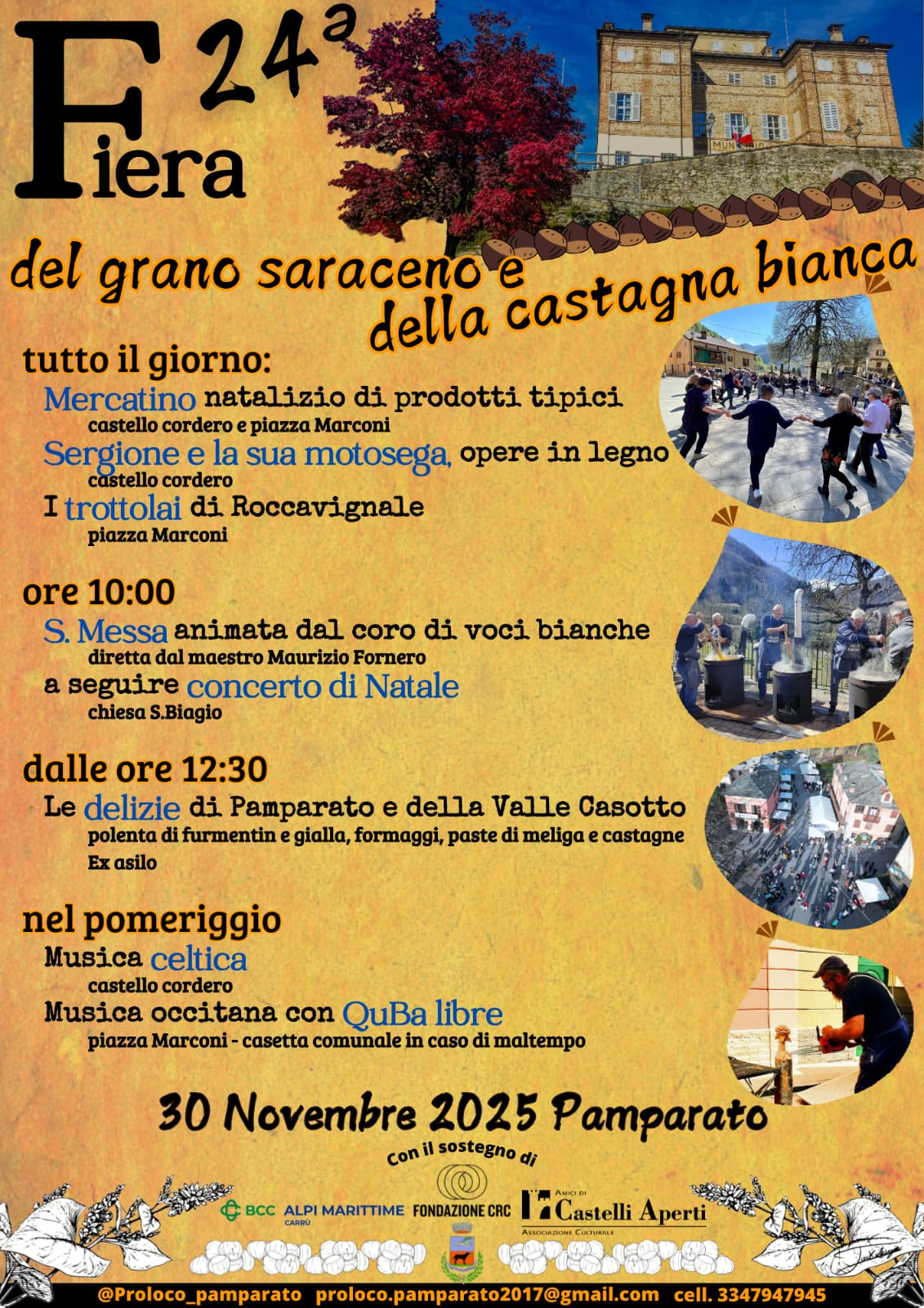 Domenica 30 Novembre vi aspettiamo per la 24ª edizione della Fiera del grano saraceno e della castagna bianca. Oltre al mercato di prodotti locali ad attendervi ci saranno i ragazzi del coro delle voci bianche della scuola comunale di Mondovì, i musicisti della Celtic Harp International Academy, i QuBa Libre, Sergione e le sue opere in legno realizzate con la motosega. Pranzo all'ex asilo con la tradizionale polenta pamparatese accompagnata per l'occasione da castagne e miele locali. La manifestazione si terrà con qualsiasi condizione metereologica.