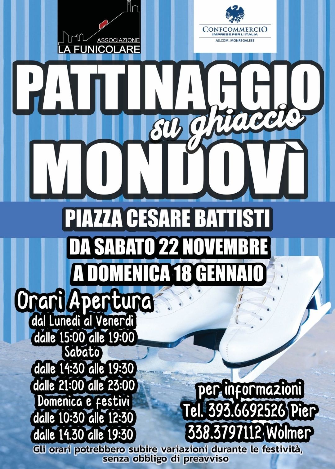Ritorna la pista di pattinaggio a Mondovì! Da sabato 22 novembre a domenica 18 gennaio 2026 sarà possibile divertirsi sul ghiaccio in Piazza Cesare Battisti. Orario: dal lunedì al venerdì 15-19, sabato 14.30-19 / 21-23, domenica e festivi 10.30-12.30 / 14.30-19, 24 dicembre 10.30-12.30 / 14.30-18, 25 dicembre 16-20, 31 dicembre 10.30-12 / 14.30-18, 1° gennaio 15.30/20.