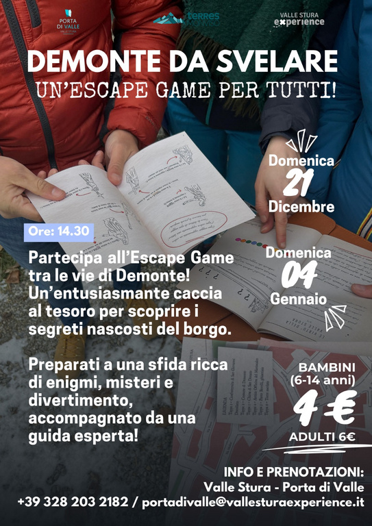 Domenica 21 dicembre e domenica 4 gennaio, a partire dalle ore 14,30 a Demonte (ritrovo presso la Biblioteca Civica), vi attende un'entusiasmante caccia al tesoro per scoprire i segreti nascosti del borgo.