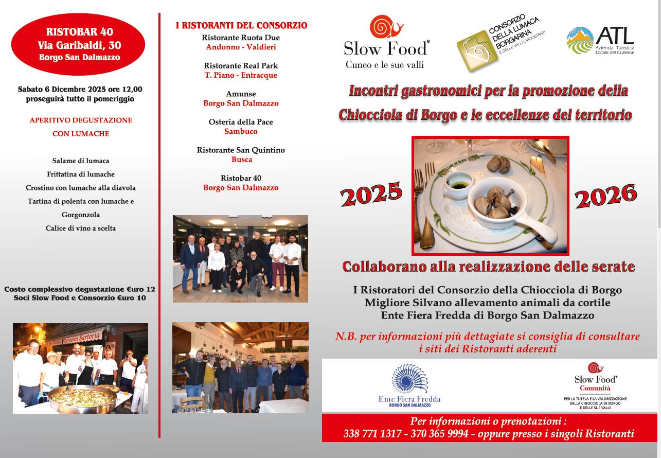 Programma delle serate gastronomiche per la promozione della chiocciola di Borgo San Dalmazzo: giovedì 22 gennaio, mercoledì 4 febbraio e giovedì 12 febbraio 2026.
