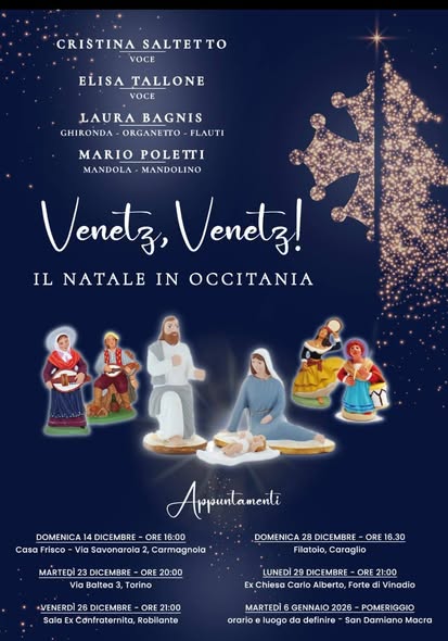 Il 26 dicembre, alle ore 21 presso la sala ex Confraternita di Robilante, ci sarà un concerto di Natale. 2 voci accompagnate dal suono della ghironda, dell'organetto, del flauto, delle mandole e del mandolino per riprendere le tipiche musiche della tradizione occitana. Ingresso libero.