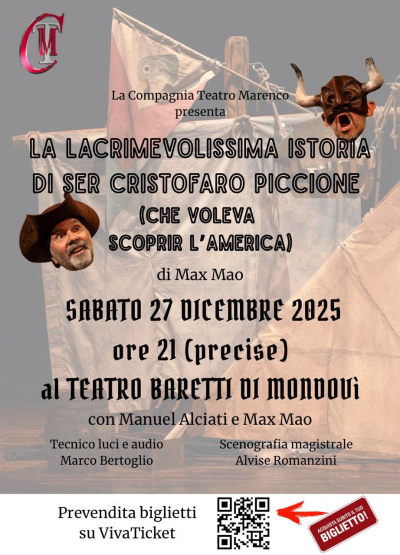 Sabato 27 dicembre alle ore 21 al Teatro Baretti di Mondovì la Compagnia Teatro Marenco di Ceva presenta lo spettacolo La lacrimevolissima istoria di Ser Cristofaro Piccione (che voleva scoprir l'America). Acquisto biglietti qui