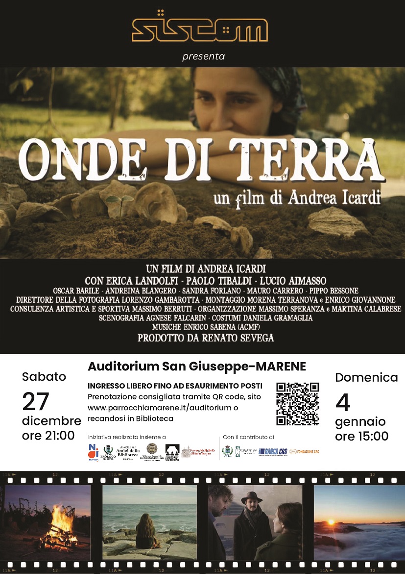 Sabato 27 dicembre alle ore 21.00 e domenica 4 gennaio alle ore 15.00 presso l'Auditorium San Giuseppe di Marene proiezione del film "Onde di Terra": ambientato nelle Langhe degli anni '70, tratta questioni sociali, la pallapugno, pagine di letteratura, amori e solitudini dalle spiagge della Calabria alle onde delle colline piemontesi. Ingresso libero.