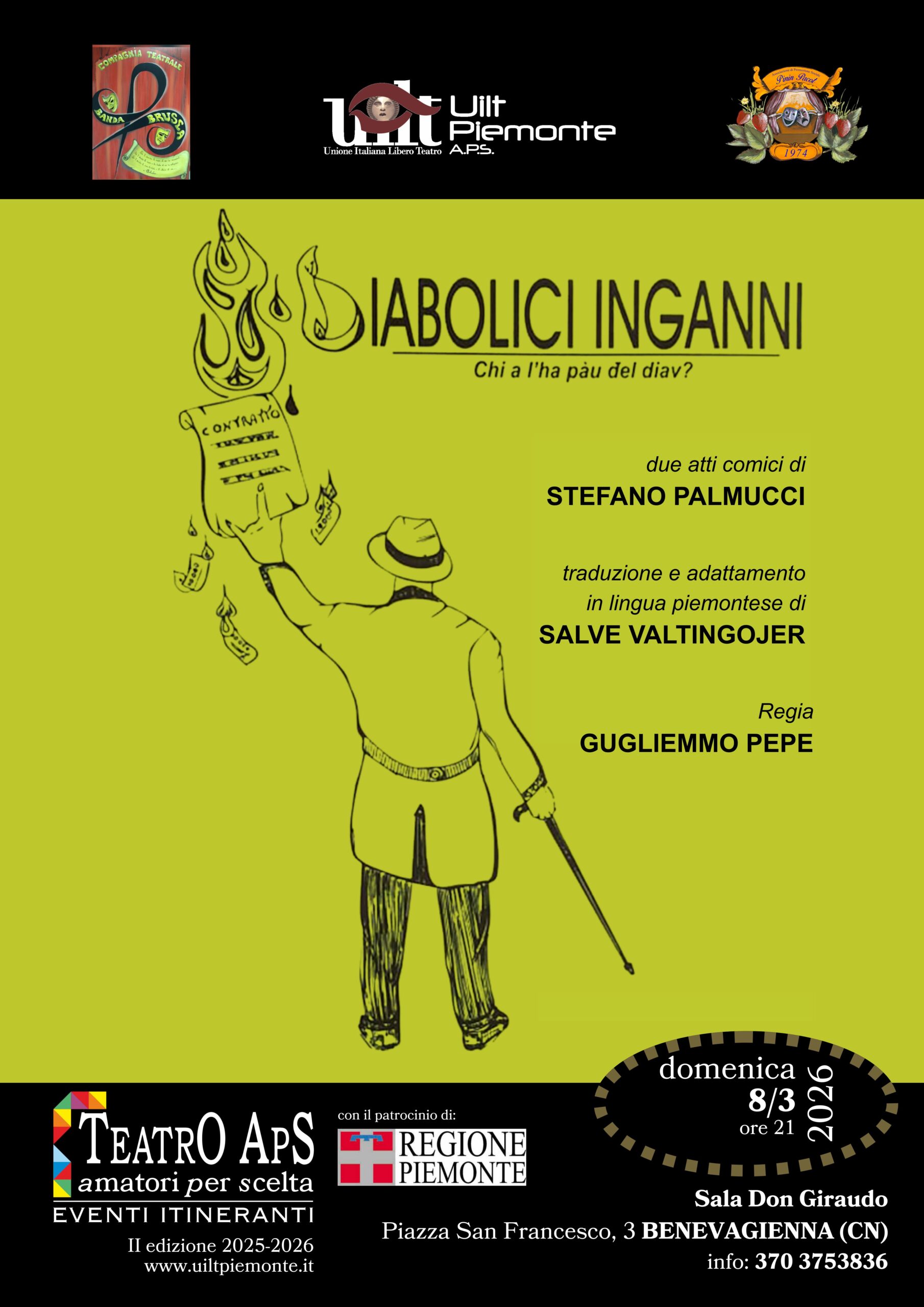 Domenica 8 marzo, alle ore 21.00, presso la Sala Don Giraudo di Bene Vagienna, nell'ambito della Rassegna Teatro APS Amatori Per Scelta organizzata da Uilt Piemonte, l'Associazione Teatrale Amatoriale Banda Brusca insieme a Pinin Pacot Aps andrà in scena con lo spettacolo "Diabolici Inganni". Due atti comici di Stefano Palmucci, introduzione e adattamento in lingua piemontese di Salve Valtingojer, regia di Gugliemmo Pepe.