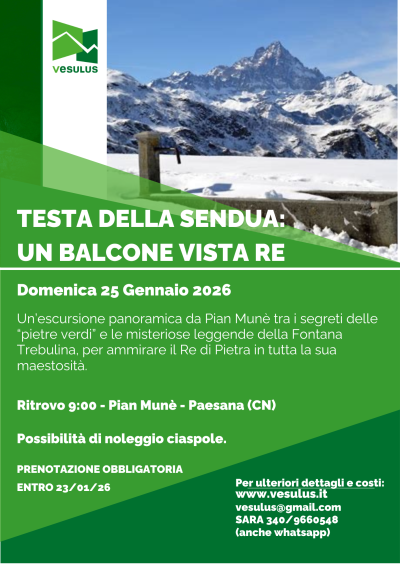 Il 25 gennaio le guide escursionistiche di Vesulus organizzano un'escursione guidata, con partenza da Pian Muné (Paesana) alle 9 verso la Testa della Sendua in un itinerario ad anello che porta al cospetto del Re di Pietra, il Monviso. Lungo il percorso si attraversano baite storiche e si approfondiscono curiosità e leggende legate alla zona, in particolare alla storica Trebulina. Prenotazione obbligatoria.