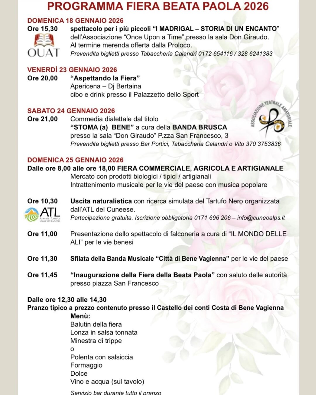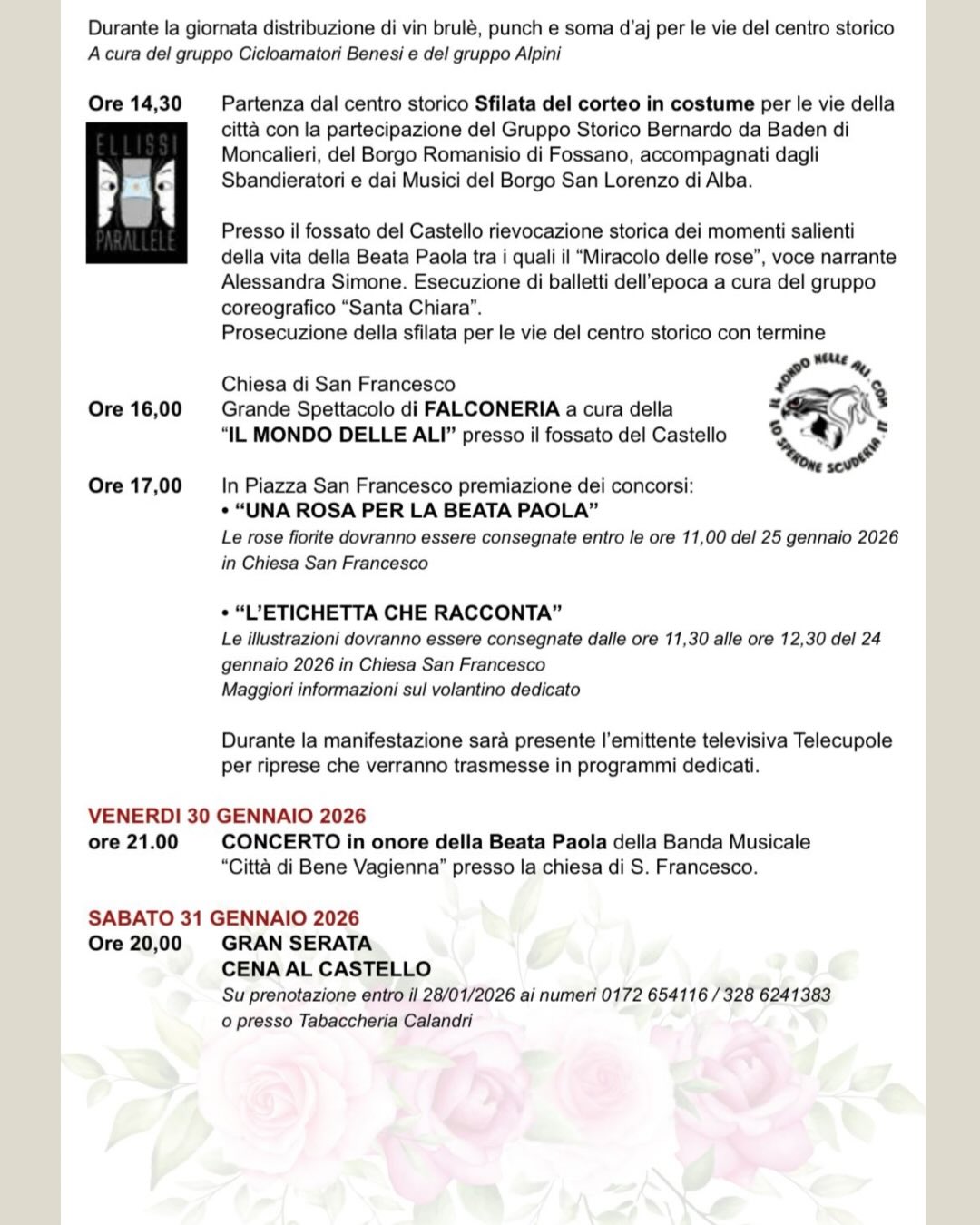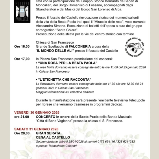 Domenica 25 gennaio a Bene Vagienna, appuntamento con le celebrazioni in onore della "Signora di Bene": la Beata Paola Gambara Costa. Il suggestivo centro storico sarà animato dalla tradizionale sfilata in costume, dal mercato, dallo spettacolo di falconeria e dalla rievocazione dei momenti più significativi della sua vita, tra cui il celebre Miracolo delle Rose. Non mancheranno appuntamenti enogastronomici e una speciale escursione gratuita con ricerca simulata del tartufo nero.