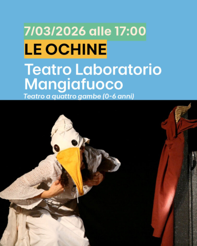 Sabato 7 marzo alle ore 17.00 un nuovo spettacolo a Cuneo della rassegna "Teatro a quattro gambe", dedicato a bambine e bambini di 0-6 anni: "Le Ochine", del Teatro Laboratorio Mangiafuoco. Appuntamento presso l'ex chiesa di Santa Chiara (via Savigliano), per ascoltare la fiaba di un’ochina che decide di deporre le uova nel bosco, e delle sue avventure. Il programma completo della rassegna è disponibile sul sito ufficiale.