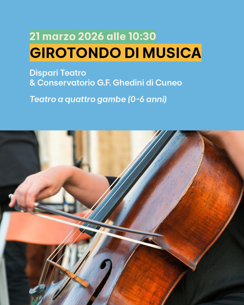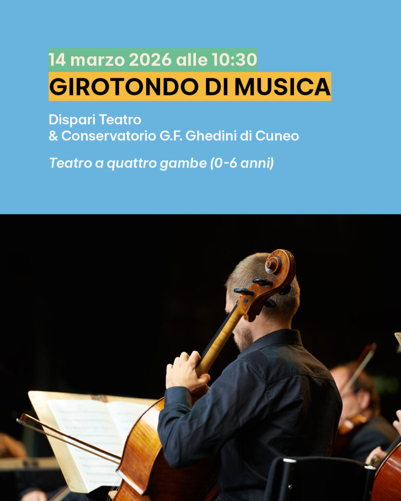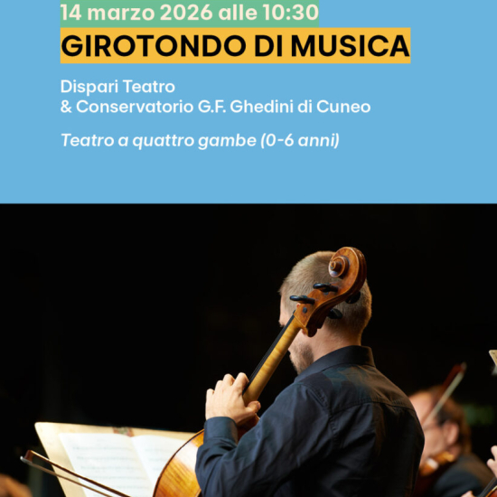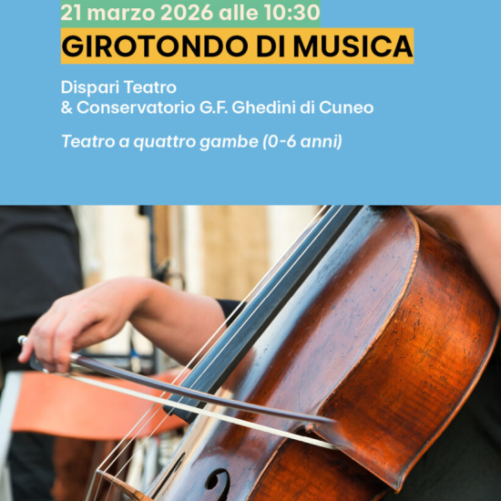 I giorni sabato 14 e 21 marzo alle 10.30 a Cuneo, presso l'ex chiesa di Santa Chiara (via Savigliano), due eventi della rassegna "Teatro a quattro gambe", dedicato a bambini e bambine dagli 0 ai 6 anni: "Girotondo di musica", di Dispari Teatro e del Conservatorio G.F. Ghedini di Cuneo. Il programma completo della rassegna è disponibile sul sito ufficiale.