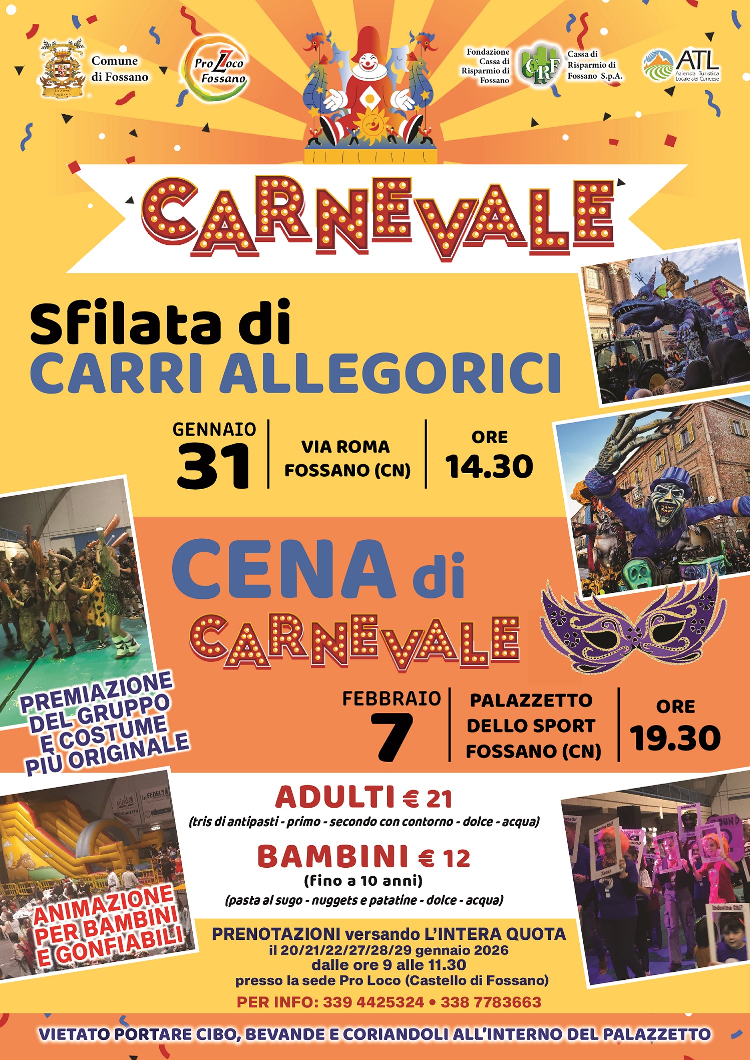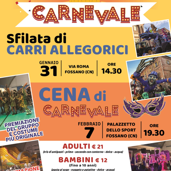 Ritorna il carnevale fossanese sabato 31 gennaio con la sfilata dei carri allegorici presso la suggestiva cornice di via Roma a Fossano: anche per questa edizione sono previsti tantissimi carri con centinaia di figuranti e la partecipazione straordinaria degli Sbandieratori dei Principi d'Acaia con il Corteo storico. Sabato 7 febbraio grande cena di Carnevale. A breve verrà pubblicato il programma completo.