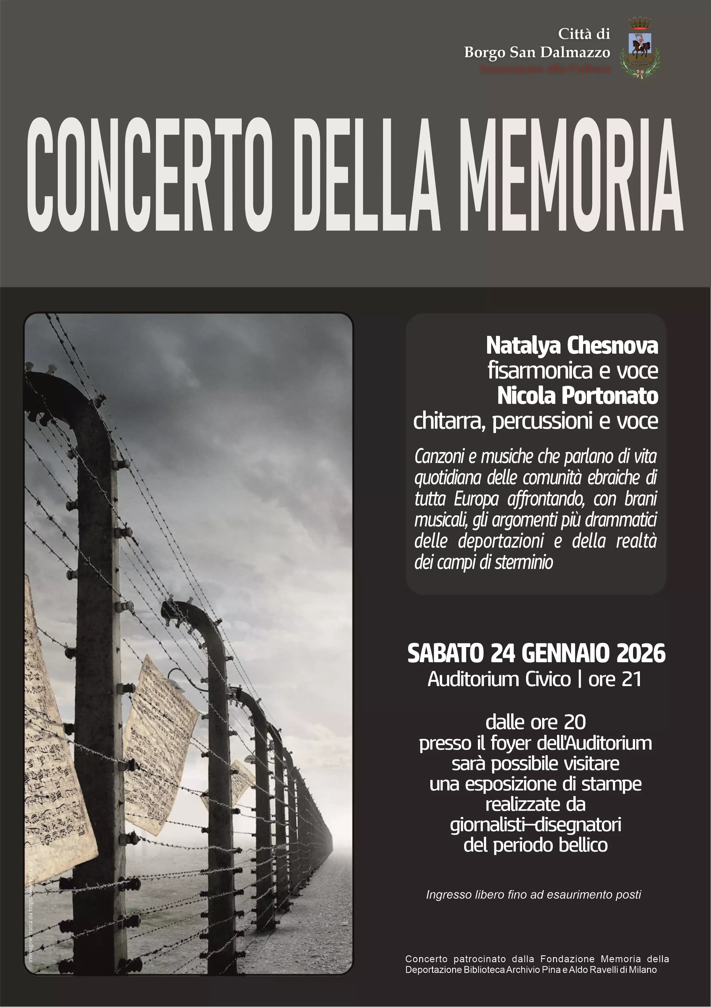 Sabato 24 gennaio, all’Auditorium Civico, dalle ore 20.00 sarà possibile visitare l’esposizione delle stampe realizzate da giornalisti e disegnatori del periodo bellico. Alle ore 21.00 seguirà il Concerto della Memoria con Natalya Chesnova (fisarmonica e voce) e Nicola Portonato (chitarra, percussioni e voce)