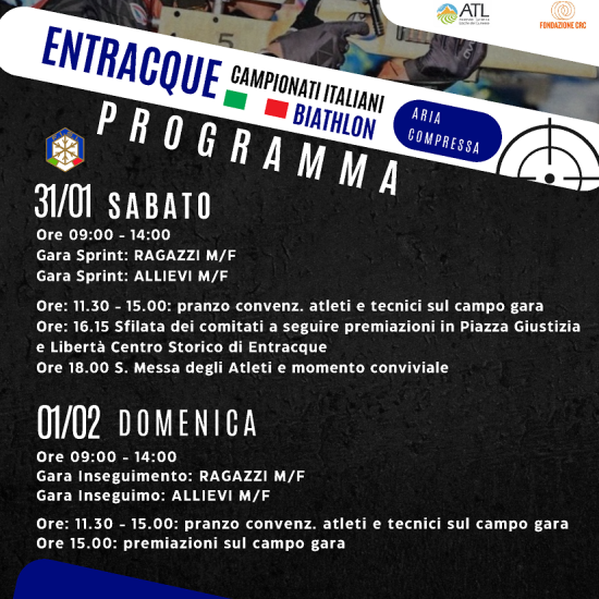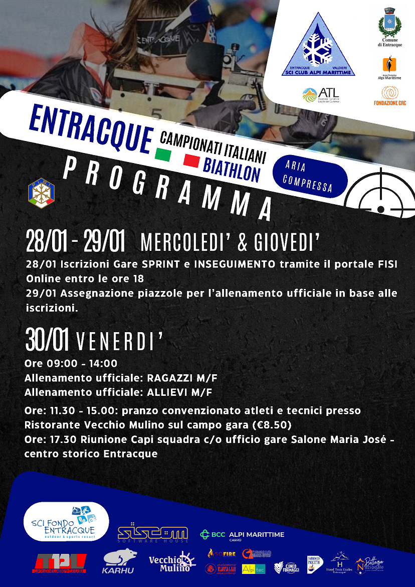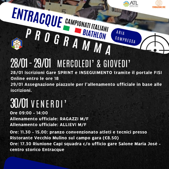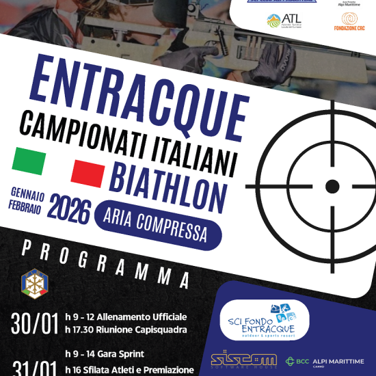 Entracque si prepara a diventare la capitale del biathlon giovanile ospitando i prossimi Campionati Italiani di aria compressa, in programma dal 30 gennaio al 1° febbraio dove oltre 260 atleti si sfideranno per aggiudicarsi i titoli italiani sprint e inseguimento. Ingresso libero.