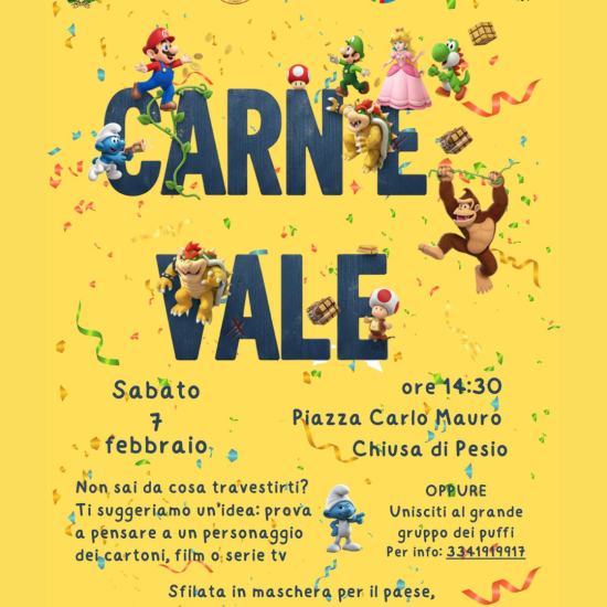 Sabato 7 febbraio a Chiusa di Pesio si festeggia il Carnevale, un appuntamento imperdibile che anima il paese con un pomeriggio di festa per grandi e piccini. Il tema di quest'anno: i grandi classici dei cartoni animati e le serie TV più amate! Ritrovo alle ore 14.30 in Piazza Carlo Mauro e partenza della sfilata in maschera.