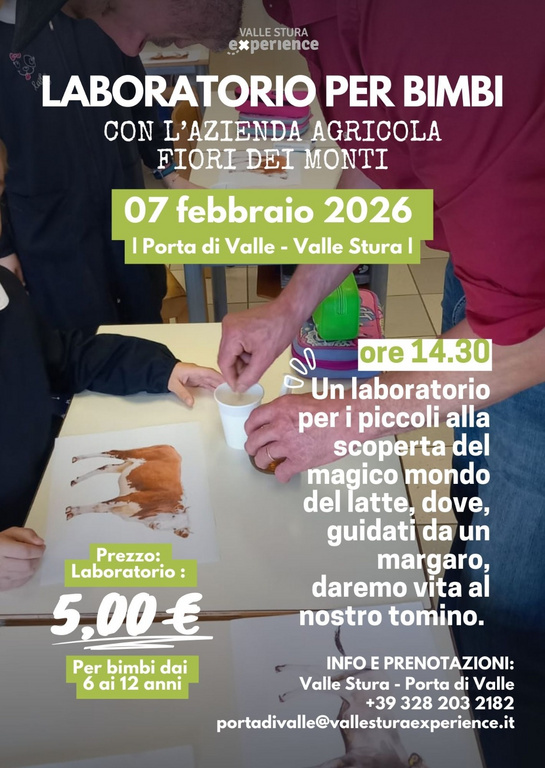 Sabato 7 febbraio, a partire dalle ore 14,30 presso la Porta di Valle a Demonte, vi aspetta un laboratorio per i più piccoli dedicato alla scoperta del magico mondo del latte. Guidati da un margaro dell'Azienda Agricola "Fiori dei Monti", i bambini realizzeranno il proprio tomino, imparando divertendosi. Evento a pagamento, prenotazione necessaria.