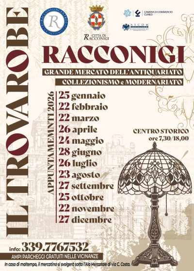 Ogni quarta domenica del mese le suggestive vie del centro storico di Racconigi ospitano il "Trovarobe": grande mercatino dell'antiquariato, del collezionismo e modernariato. Appuntamento il 25 ottobre dalle ore 7.30 alle ore 18.00.