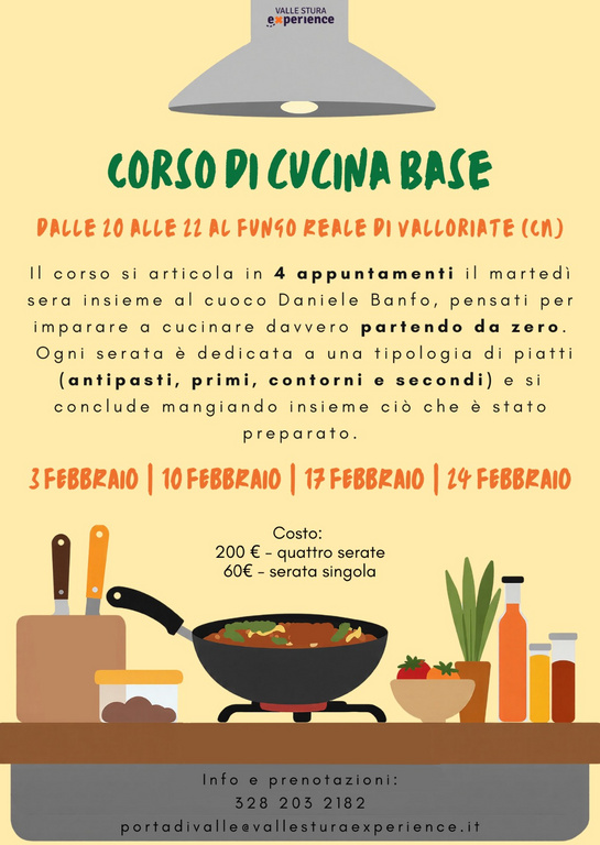 Il consorzio Valle Stura Experience organizza un corso, articolato in quattro appuntamenti, pensati per imparare a cucinare partendo da zero. Appuntamento a Valloriate, al Fungo Reale dalle 20 alle 22, in compagnia del cuoco Daniele Banfo. Il 10 febbraio lezione sui primi piatti che si concluderà assaggiando ciò che è stato preparato. Il corso è su prenotazione e a pagamento e sarà possibile iscriversi a tutte e quattro le serate o ad una singola lezione.