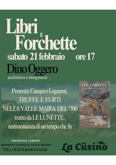 Libri e Forchette è una rassegna di pomeriggi dedicati ai racconti, ai libri e al cibo di montagna, ospitata da La Cusino – Rifugio e Ristorante, a Celle Macra, nel cuore della Valle Maira. Sabato 21 febbraio alle ore 17.00 Dino Oggero (architetto e insegnante) presenta: "Canapa e legnami, truffe e furti nella Valle Maira del ’700", tratto da Le Lunette, testimonianza di un tempo che fu. Ingresso libero.