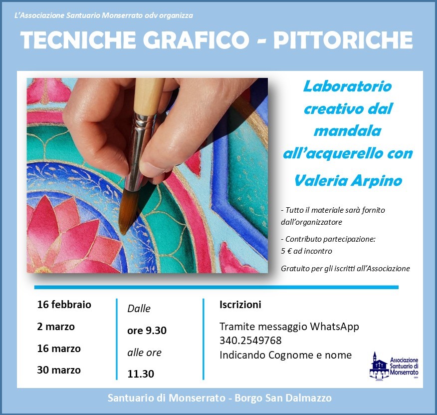 L’Associazione Santuario di Monserrato ODV propone un nuovo percorso dedicato all’espressione artistica e alla creatività: il Laboratorio creativo tecnico grafico di pittura “Dal mandala all’acquerello”, condotto da Valeria Arpino, nelle mattinate del 16 febbraio, 2, 16 e 30 marzo, con inizio alle ore 9.30 presso il Santuario di Monserrato a Borgo San Dalmazzo .