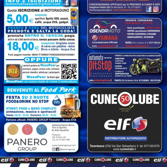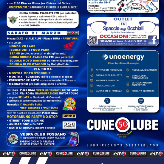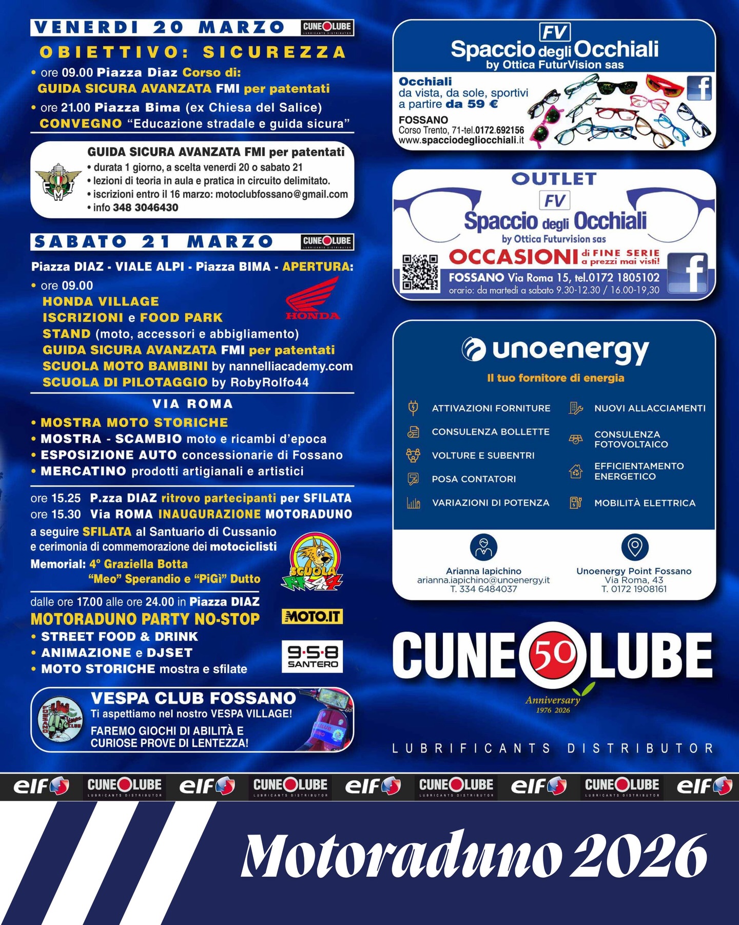 Da venerdì 20 marzo a domenica 22 marzo torna a Fossano il tradizionale Motoraduno di Primavera, che quest'anno assume una dimensione internazionale grazie a un prestigioso riconoscimento della Federazione Internazionale di Motociclismo. Un intero weekend dedicato alla passione per le due ruote, con stand espositivi, mercatino, moto storiche, test drive e mototour. Ad animare l'evento non mancheranno musica live e intrattenimento per tutta la durata della manifestazione.