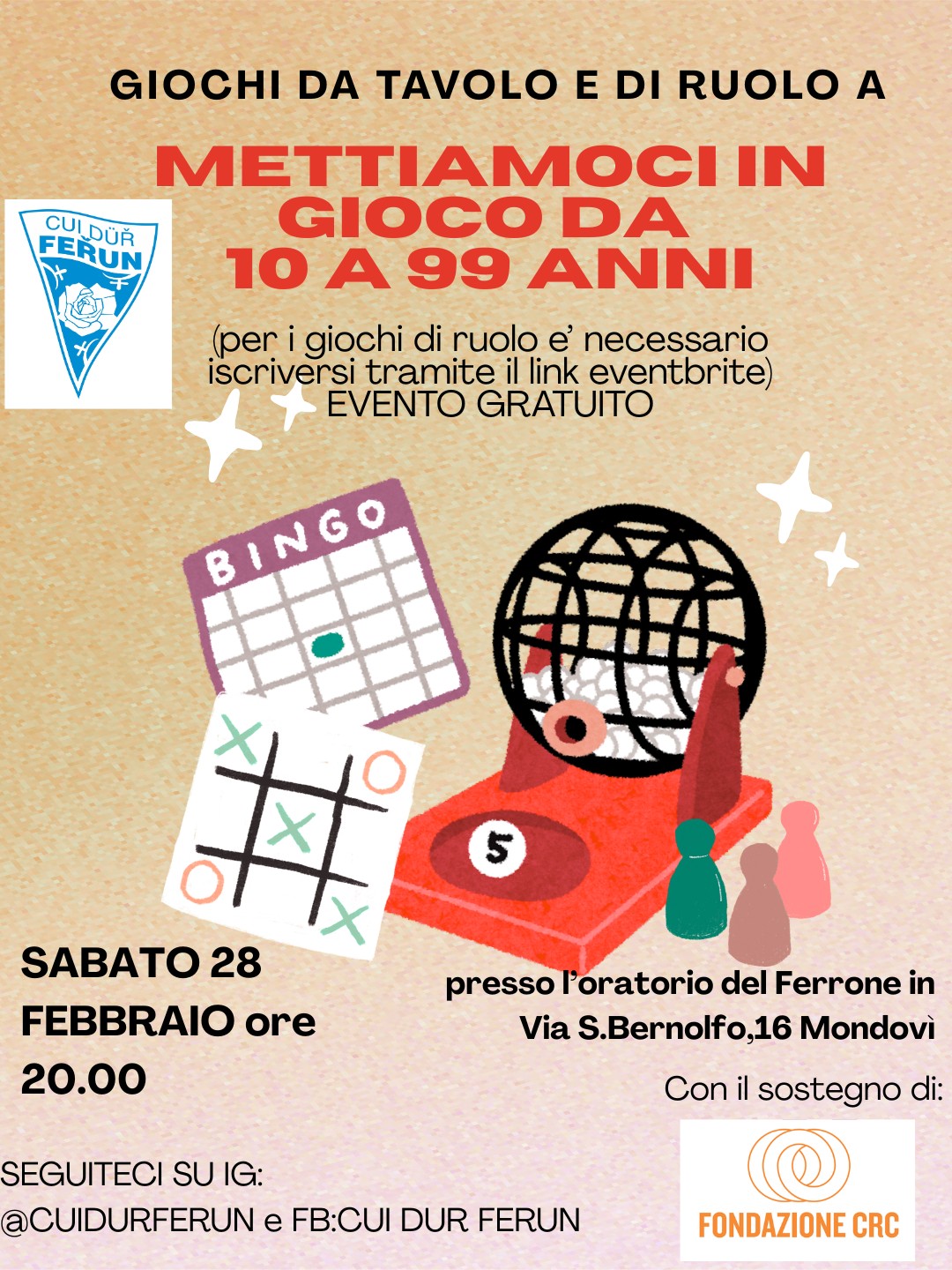 Un nuovo appuntamento di “Mettiamoci in gioco” è in arrivo sabato 28 febbraio 2026 a partire dalle ore 20 presso i locali dell’oratorio della Parrocchia di Santa Maria Maggiore a Mondovì Borgo Ferrone in Via San Bernolfo n.16.Sarà possibile prendere parte ai tavoli dei giochi di ruolo (iscrizione obbligatoria su Eventbrite) e/o cimentarsi in giochi da tavolo, per i quali non è necessaria la prenotazione. L’evento è gratuito.