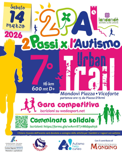 Sabato 14 maggio Mondovì torna ad ospitare “2 passi per l’autismo”, evento organizzato dall’Associazione sportiva Team Marguareis insieme ad Autismo Help Cuneo OdV. Un appuntamento sempre molto atteso che anche quest’anno prevede la corsa competitiva e la camminata solidale adatta a tutti. L’intero ricavato della giornata verrà devoluto al sostegno delle persone con autismo e delle loro famiglie. Iscriviti alla corsa competitiva o alla camminata solidale