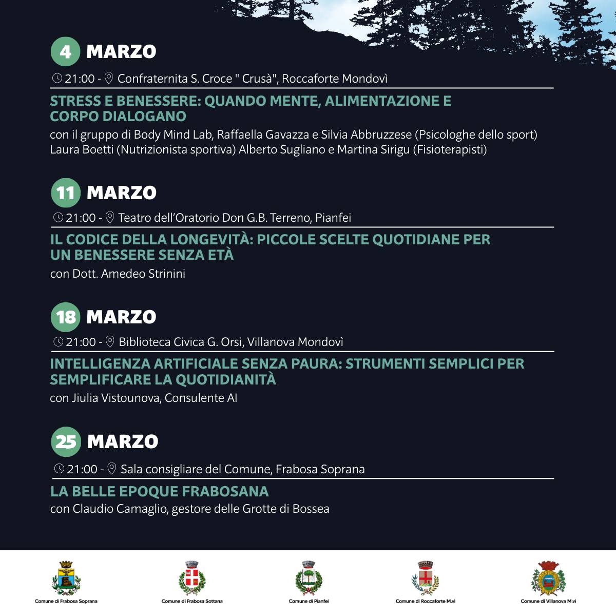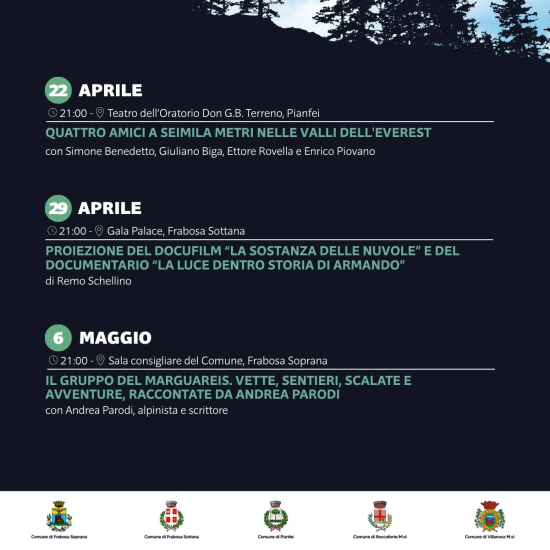L'Unione Montana Mondolé ha presentato il calendario degli appuntamenti serali del progetto "Università del Mondolé 2026". Da marzo a maggio, ogni mercoledì alle 21.00, la cultura accende le serate di Frabosa Soprana, Frabosa Sottana, Pianfei, Roccaforte Mondovì e Villanova Mondovì. Salute, intelligenza artificiale, sport, ambiente, relazioni, tradizioni locali e grandi avventure tra le vette del Marguareis e dell’Everest: appuntamenti da non perdere!